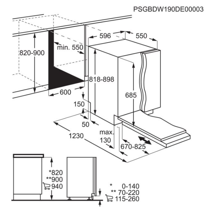 Beépítési méretek mag. (min/max)xszél.xmély.): 820/900 x 600 x 550 mm