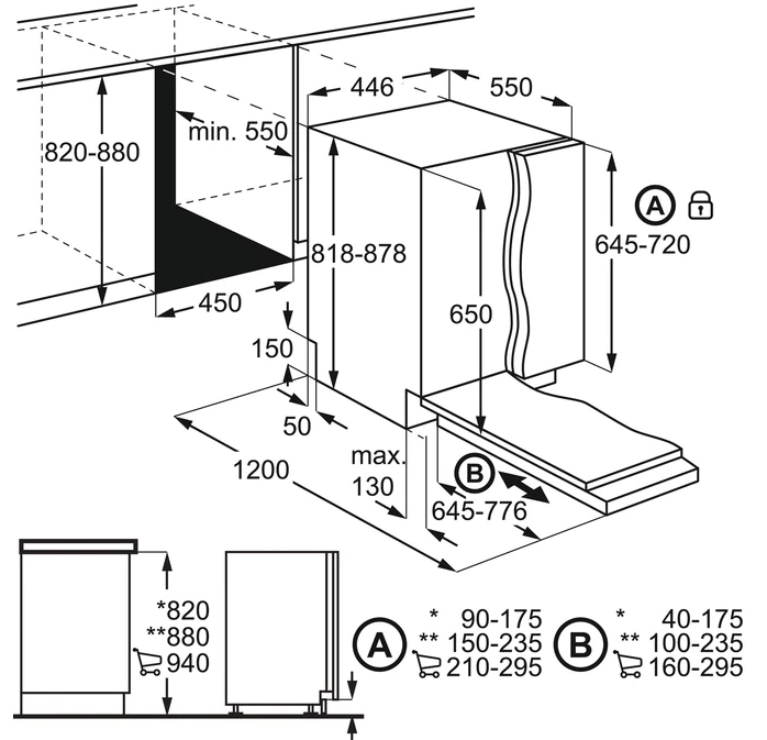 Beépítési méretek mag.(min/max)xszél.xmély.(mm): 820/900 x 450 x 550