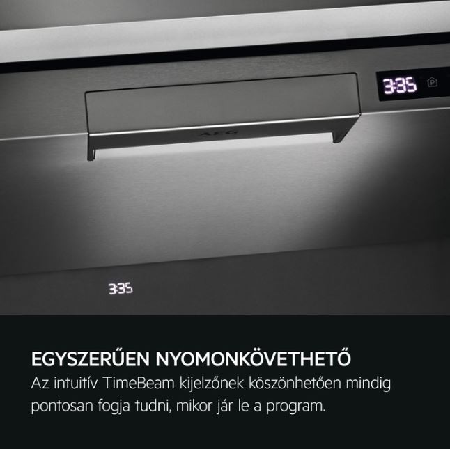 • TimeBeam funkció - a készülék ajtaja alatti padlóterületre vetíti ki a program indításakor a program időtartamát, a program végén a 0:00 és CLEAN üzenetet, a DELAY üzenetet és a késleltetett indításig hátralévő időt, készülék meghibásodása esetén a riasztási kódot.