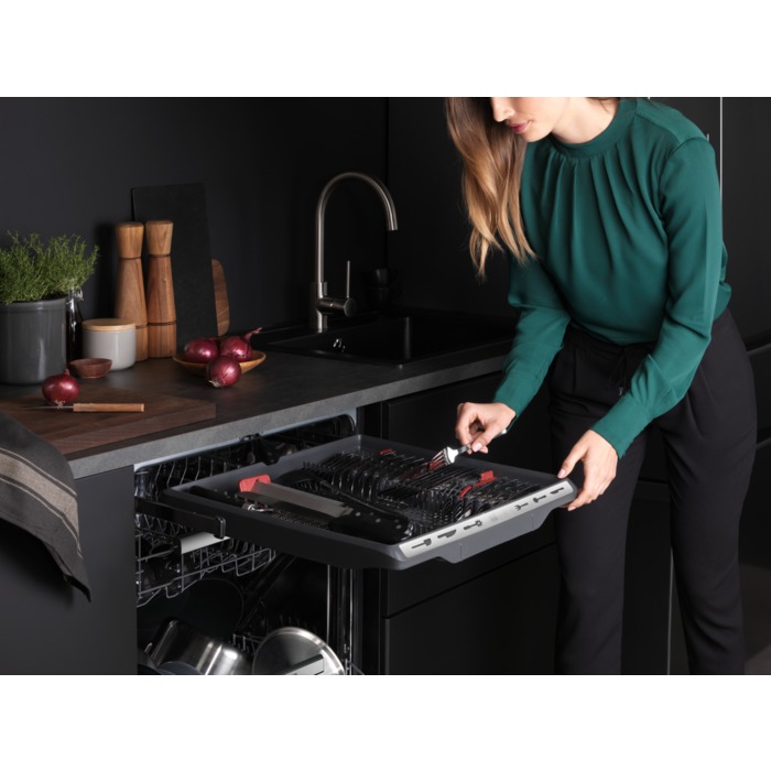 • MaxiFlex rekesz - segítségével minden könnyen elhelyezhető a mosogatógépben. Kialakításának köszönhetően evőeszközök és bármely méretű edények befogadására is alkalmas – legyen akár extranagy vagy szabálytalan alakú. A rugalmasan áthelyezhető elválasztóelemek és a maximalizált mélység bármilyen töltet esetén egyedi megoldást tesz lehetővé, így minden egyes darab könnyen elhelyezhető és megtisztítható.