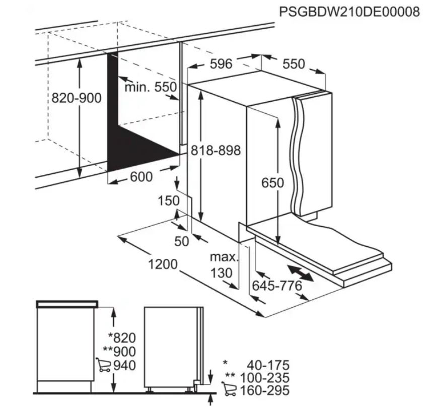 Beépítési méretek mag. (min/max)xszél.xmély.): 820/900 x 600 x 550 mm