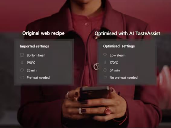 Az AI TasteAssist gőzzel optimalizálja a hagyományos recepteket. Egyszerűen elküldhető a webes recept a sütőnek az AEG alkalmazáson keresztül és az AI optimalizálja az időt, a hőmérsékletet és a funkciót, hogy kevesebb energiával táplálóbb és ízletesebb ételek készülhessenek. Az AI TasteAssist egy AEG alkalmazás, amely olasz, francia, német, angol, svéd és holland nyelvű recepteket tud importálni. A 2025-ös év folyamán a következő nyelvekkel bővül: lengyel, cseh, magyar, román, norvég és dán. Az AEG elérhető az App Store-ban és a Play Store áruházban.