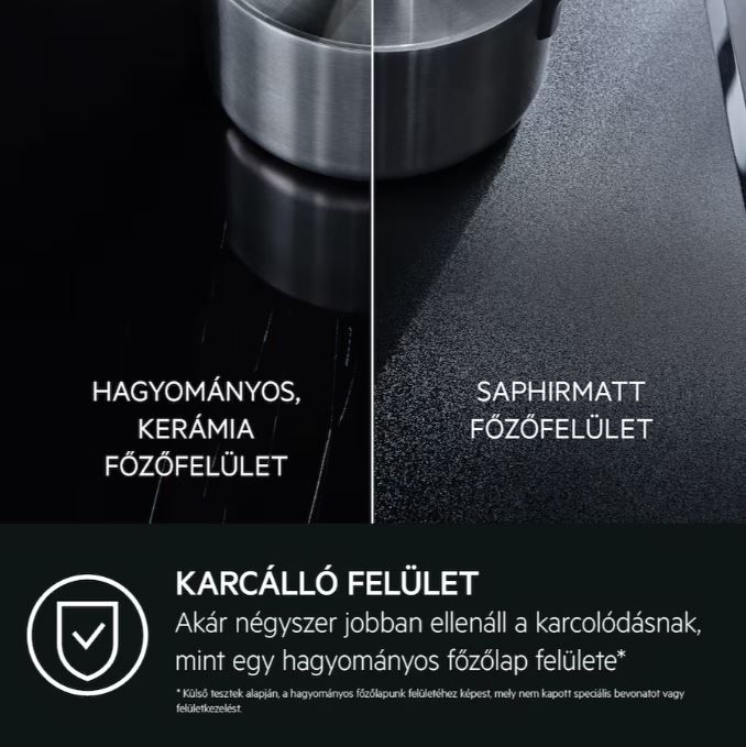 Egy modern dizájnelem a konyha középpontjában. A SaphirMatt® főzőlap matt fekete felülete elegáns, minimalista megjelenésű. A legkarcállóbb, ujjlenyomat-taszító felületű főzőlap, mely hosszú ideig szép marad.