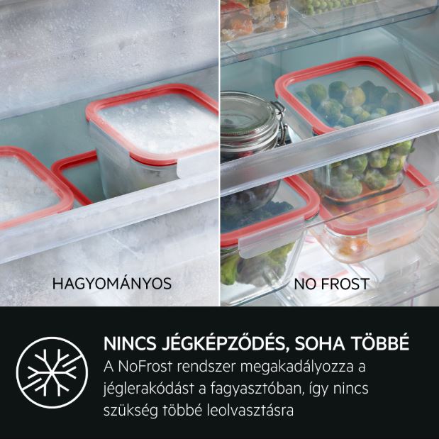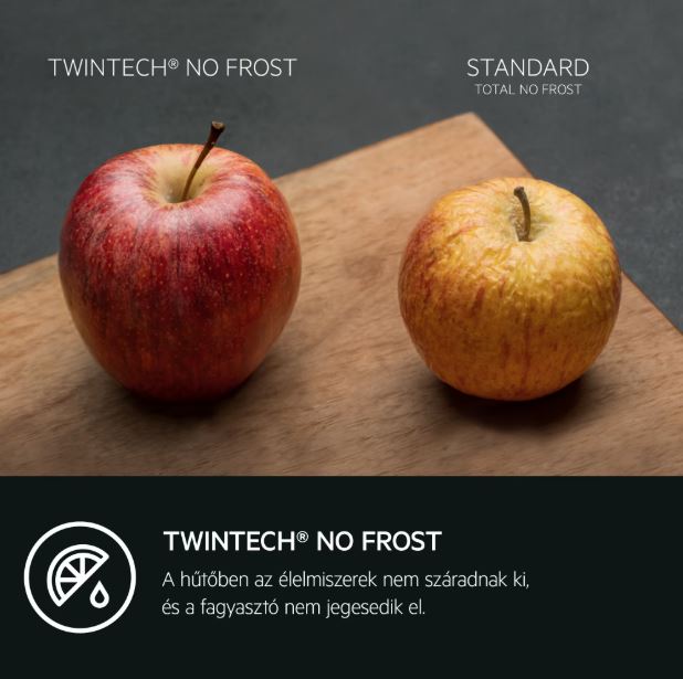 A TwinTech® NoFrost technológiával a hűtőszekrény megóvja az ételek hozzávalóit és az ízeket. A szokásosnál nagyobb fagymentesség érhető el, mivel két hűtőrendszert tartalmaz: hűtőszekrényhez és a fagyasztóhoz. A fagyasztó nem fagyos. A hűtőszekrény nedvességtartalmát optimálisan tartják, így 60% -kal kevesebb az élelmiszer tömegvesztesége, és az összetevők lédúsak maradnak.