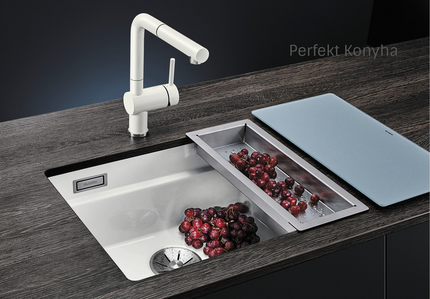 A tetszetős mosogatótálcához a konyhai munka kényelméért válasszon hozzáillő, egymással tökéletesen összehangolt csaptelepet, átüthető csaphely furatba illeszthető mosogatószer-adagolót, illetve a rendkívül ötletes hulladéktároló rendszer valamelyikét.