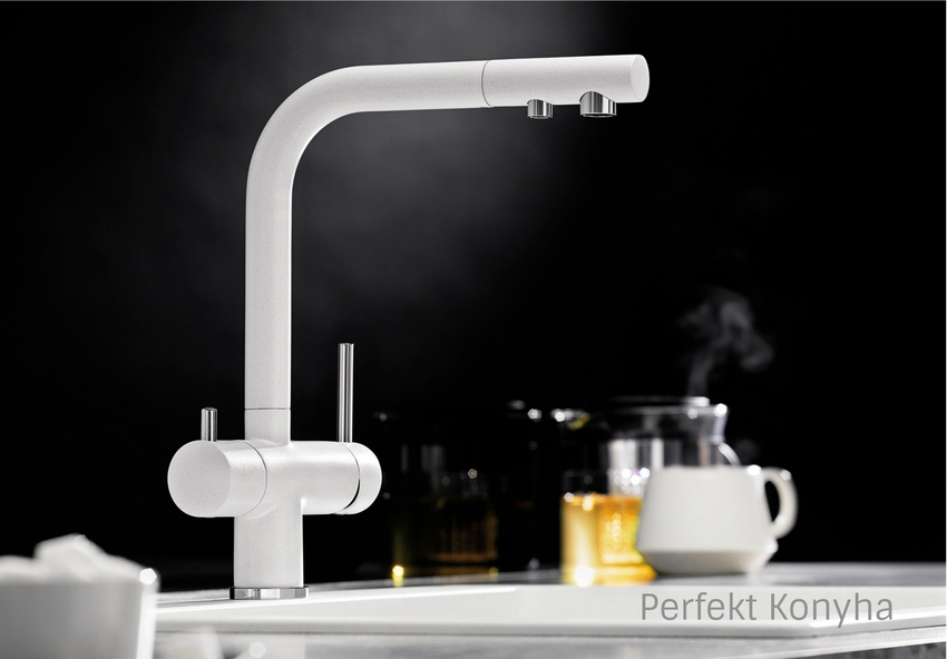 • integrált kifolyó, a hálózati víz és a vízszűrővel tisztított víz külön szabályozható - jobboldali kezelőkarral a hideg és meleg víz szabályozható, míg a baloldali karral a tisztított víz