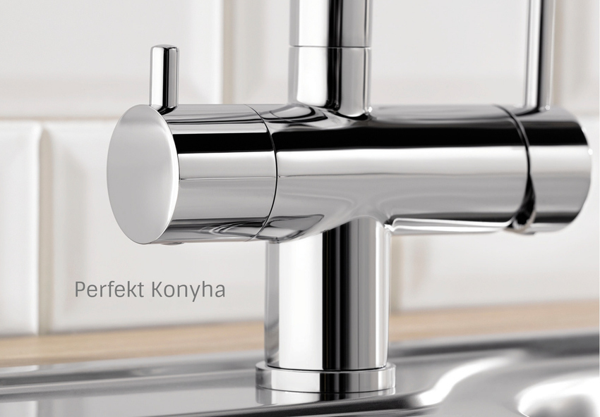 - integrált kifolyó, a hálózati víz és a vízszűrővel tisztított víz külön szabályozható - jobboldali kezelőkarral a hideg és meleg víz szabályozható, míg a baloldali karral a tisztított víz