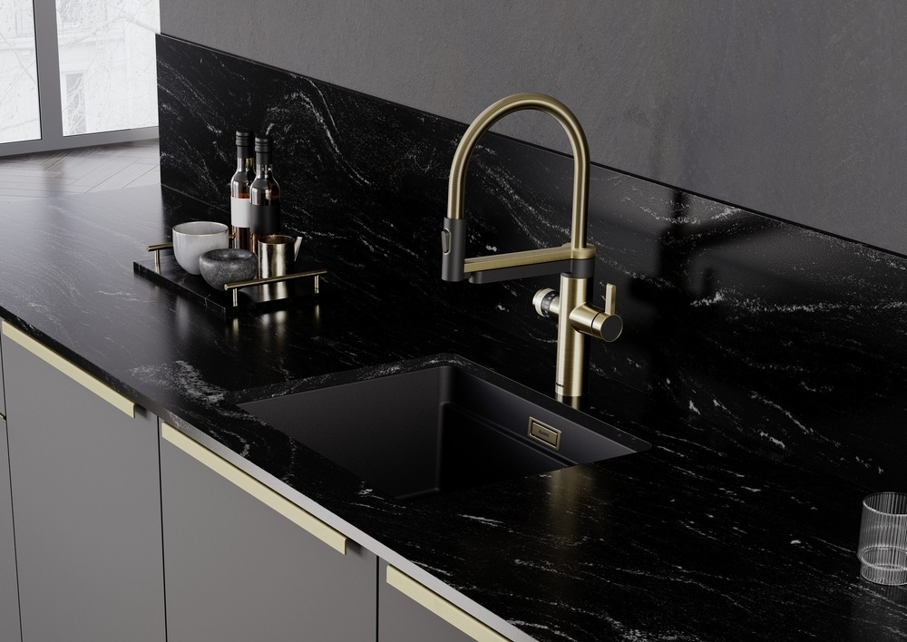Tökéletes egységet alkotnak a satin gold csappal, adagolóval és excenteres vezérléssel.