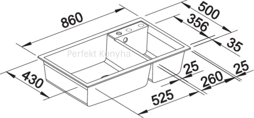 - 1 db kialakított és 2 db átüthető csaphely furattal rendelkezik, így a csaptelep mellett egy mosogatószer-adagoló, egy utólag beszerelhető dugókiemelő vagy egy tisztított víz vételére alkalmas csaptelep is elhelyezhető