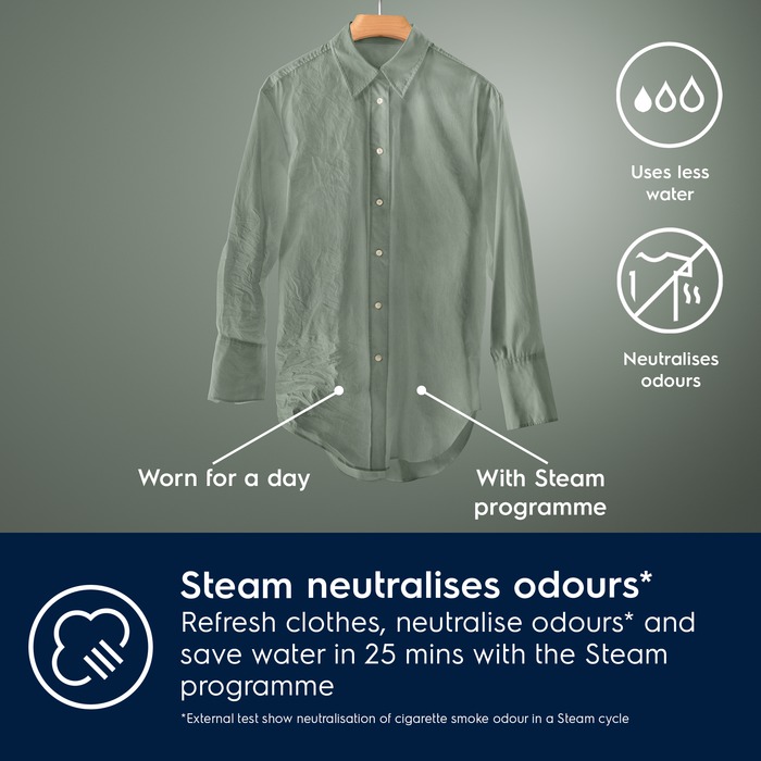 A SteamCare program gőz segítségével regenerálja a ruhákat, csökkenti a gyűrődéseket és minimalizálja a vasalási igényt annak érdekében, hogy a ruhák hosszabb ideig megőrizzék formájukat és mintázatukat. Sőt, az illatanyagokat kíméletes gőzzel kombináló FreshScent rendszer segítségével két mosás között fel is frissíthetők a ruhák.
