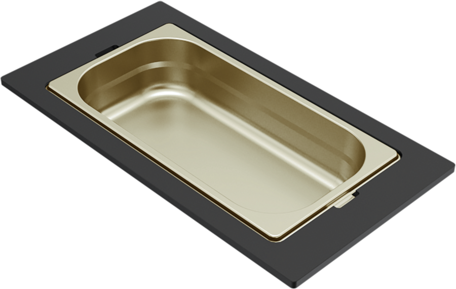 Egyrészes alumínium tároló edény arany színben, fekete HPL kerettel.