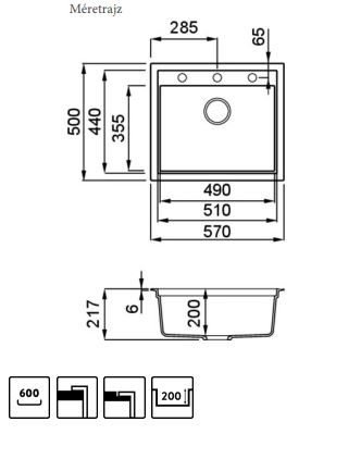 Medence méretei: 490 x 355 x 200 mm