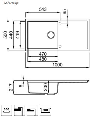 Medence méretei: 470 x 419 x 200 mm