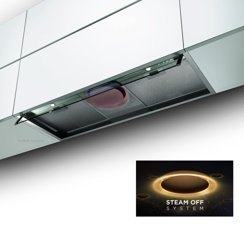 STEAM OFF SYSTEM - teljesen kizárja a páraelszívó alatti és körüli páralecsapódást. Változó geometriájú, ellenőrzött légsugarak két örvényt keltenek, amelyek irányítják a füst és a pára bejutását.