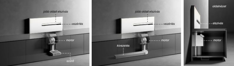 - belső keringtetési üzemmód esetén Aktívszén-szűrő – ebben az üzemmódban az elszívott levegő a zsírszűrőkön áthaladva, egy aktívszén-filteren is keresztülhalad, mely némileg megszűri a kellemetlen szagokat, gőzöket, majd a megtisztított levegő (a páratartalommal együtt) visszakerül a konyha levegőjébe. Ebben az esetben a kapacitás a szénszűrő állapotától (elhasználódás) függően csökken. Ennek elkerülése érdekében az aktívszén-szűrőket használattól függően 3-6 havonta cserélni kell. Ezek mellett különös figyelmet kell fordítani a fém zsírszűrők folyamatos tisztántartására, szükség esetén ezek cseréje is javasolt. Ez az üzemeltetési mód csak akkor ajánlott, ha a kivezetésre nincs mód.