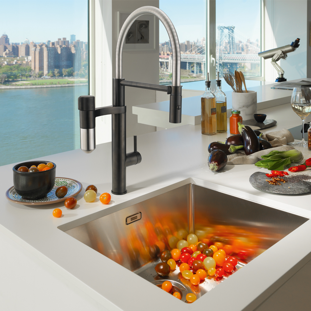 Nyitólap  »  Csaptelep  »  Franke Vital Semi Pro fekete/inox 3 az 1-ben kihúzható zuhanyfejes csaptelep szűrőcsappal