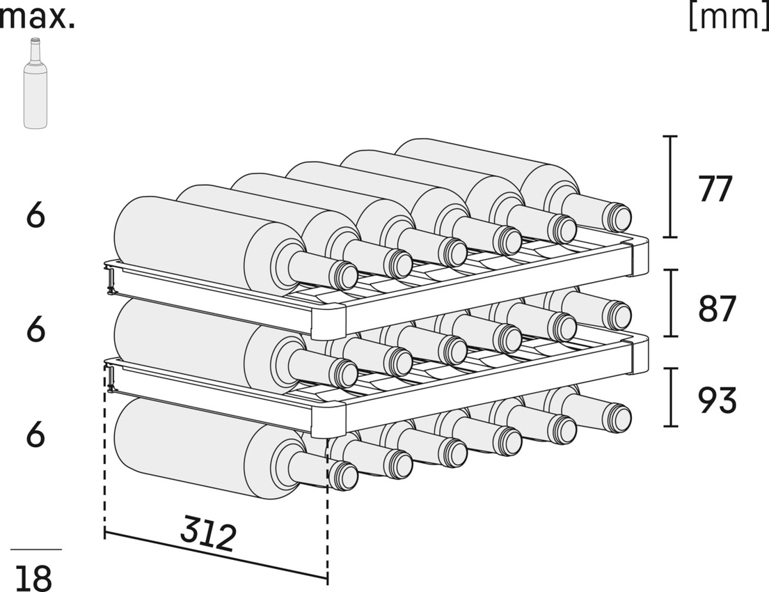 - 18 boros palack (0,75 literes bordói palack) tárolása