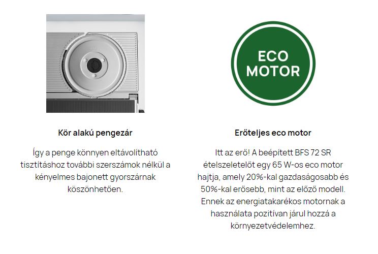 Az AES 72 SR beépített ételszeletelő a lehető legnagyobb stabilitást és a legjobb vágási eredményt garantálja kiváló minőségű, teljes fémszerkezetének köszönhetően.