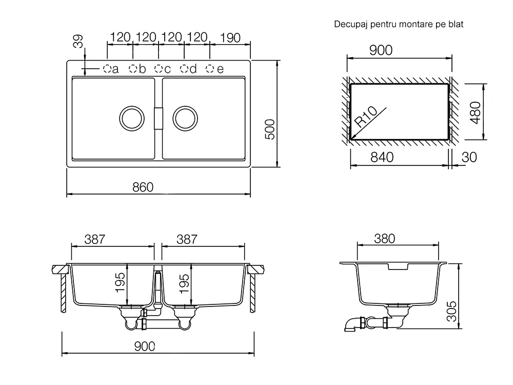 egymás mellett 5 átüthető csaphely furat található, ezáltal a medence felső részén a csaptelep mellett egy mosogatószer-adagoló és egy tisztított víz vételére alkalmas csaptelep is elhelyezhető