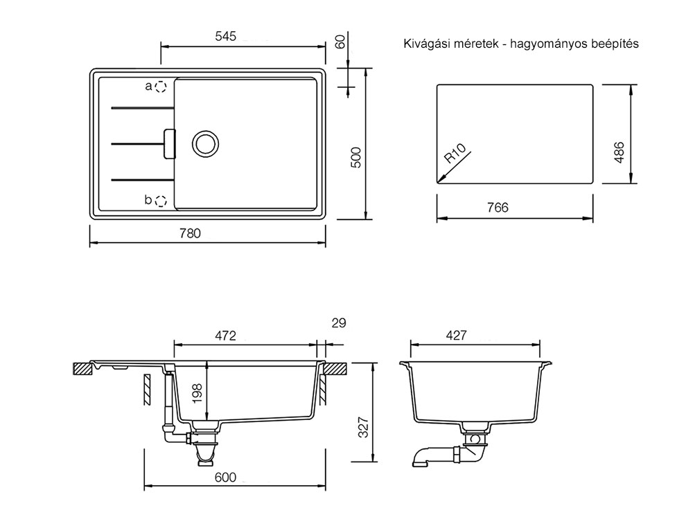 A csomag lefolyógarnitúrát (mosogatógép vagy mosógép csatlakozással), szűrőkosaras lefolyót, rögzítőkapcsokat és gyémántfúrót tartalmaz.