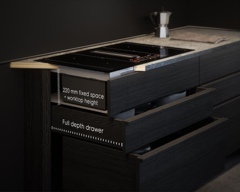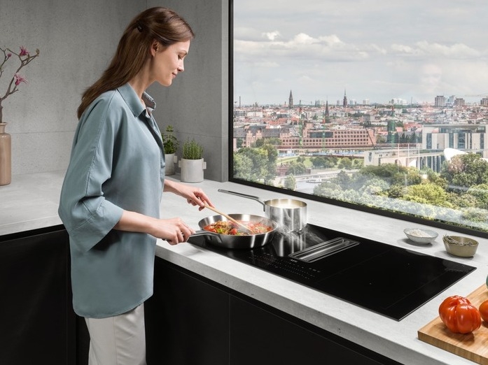 A hatékony páraelszívóval egybeépített indukciós főzőlap nagyobb szabadságot kínál a konyha kialakításában. Nem kell külön helyet találni a főzőlapnak és az elszívónak.