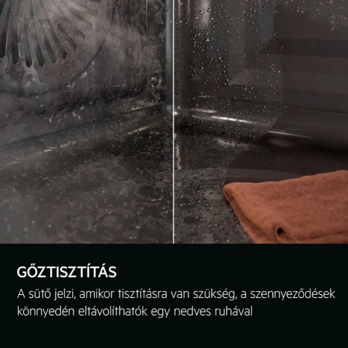 A gőztisztításos sütő értesítést küld, ha eljött a tisztítás ideje. A tisztító program után egy nedves ruhával könnyedén eltávolíthatók a szennyeződések. A foltok tisztításához gőzt használva akár 95%-kal kevesebb energiát használ, mint a pirolitikus tisztítás.