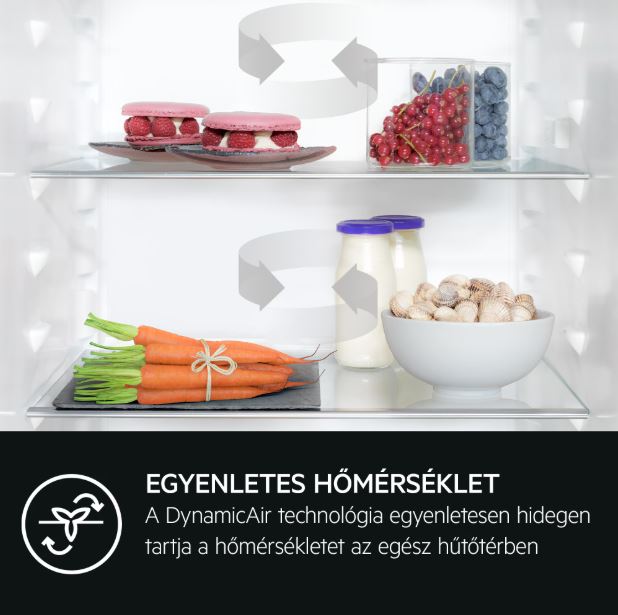 A DynamicAir technológia az egész hűtőszekrényben egyenletesen tartja a hőmérsékletet, amely a legbiztonságosabb tárolást biztosítja a friss élelmiszerek számára.
