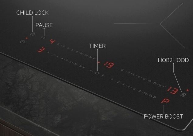 - Vezérlés funkciók: 3 lépéses maradékhő kijelzés, hangjelzés, automata felfűtés, Booster funkció, gyerekzár, eltelt időmérés, Eco timer, energiagazdálkodás, Hob2Hood vezérlés, billentyűzár (key-lock), percszámláló, szünetelés, hang ki, időzítő
