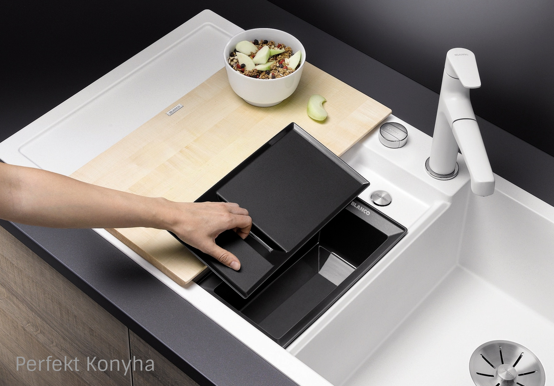 - integrált tároló tál maradékgyűjtéshez: tökéletesen kombinálható a BLANCO SELECT és BLANCO FLEXON II hulladéktárolókkal