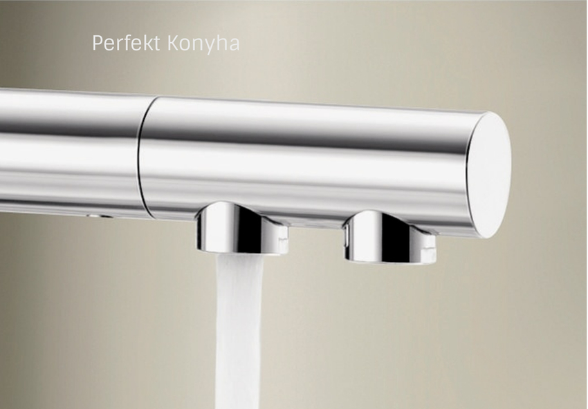 - integrált kifolyó, a hálózati víz és a vízszűrővel tisztított víz külön szabályozható - jobboldali kezelőkarral a hideg és meleg víz szabályozható, míg a baloldali karral a tisztított víz