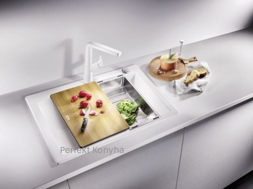 - középen 1 db kialakított és a csaptelep sáv két szélén 1-1 átüthető csaphely furat található, így a mosogatótálca felső részén kényelmesen elfér a csaptelep, a mosogatótálcához alaptartozékként járó dugókiemelő, egy mosogatószer-adagoló, vagy egy tisztított víz adagolására alkalmas csaptelep. A csaptelep és a tisztított víz adagolására alkalmas csaptelep kiváltható egy víztisztító berendezésre csatlakoztatható – BLANCO TRIMA vagy FONTAS II – csapteleppel, így akár az összes kiegészítő is elhelyezhető.