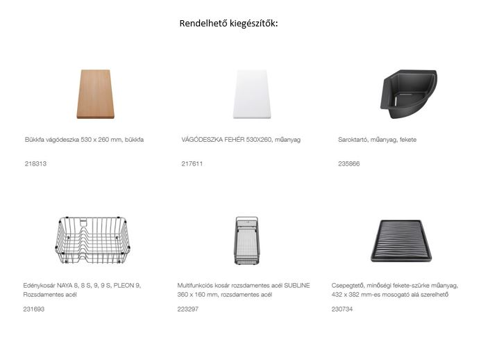 A tetszetős mosogatótálcához a konyhai munka kényelméért válasszon hozzáillő, egymással tökéletesen összehangolt csaptelepet, átüthető csaphely furatba illeszthető mosogatószer-adagolót, illetve a rendkívül ötletes hulladéktároló rendszer valamelyikét.