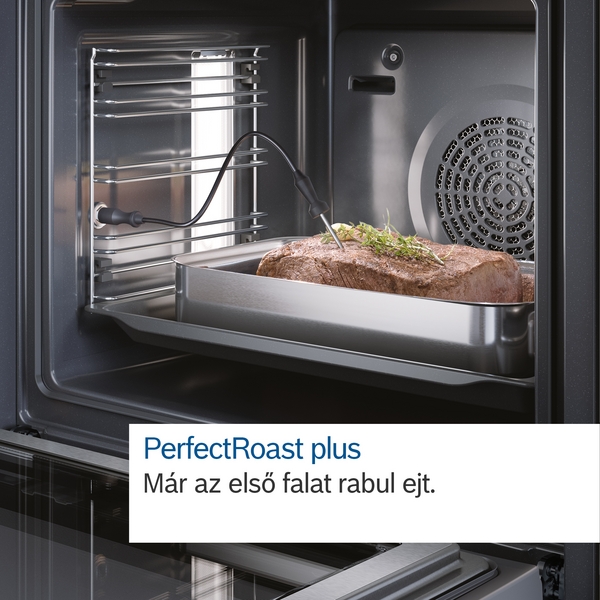 - PerfectRoast Plus maghőmérő - a marhasült, illetve egész hal és csirke esetében az időzítés a legfontosabb. A hússzonda három mérőpontot használ az étel hőmérsékletének ellenőrzésére. A kiválasztott belső maghőmérséklet elérésekor az étel tökéletesre sül. A mesterséges intelligenciának köszönhetően a sütő még azt is meg tudja mondani, hogy hány perc van hátra az étel tálalásáig, így tökéletesre időzíthető az étkezés. A PerfectRoast Plus használatához egyszerűen csatlakoztatni kell a sütőt a regisztrált Home Connect fiókhoz. Ezenkívül a MeatProbe Assistant segítséget nyújt a legjobb sütőbeállításhoz a kívánt készenléti fok elérése érdekében. Például a marhabélszín medium-rare eléréséhez az Asszisztens a megfelelő maghőmérsékletet ajánlja – jelen esetben 58°C-ot.