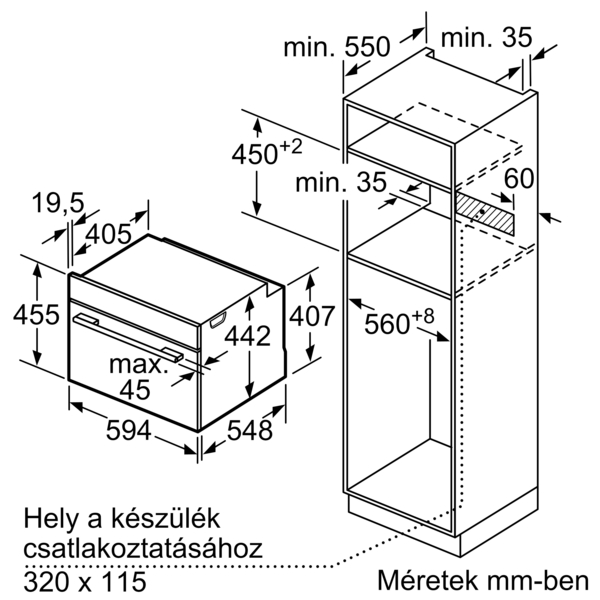 - Beépítési méretigény (ma x szé x mé): 450 mm – 455 mm x 560 mm – 568 mm x 550 mm