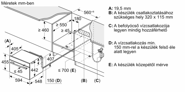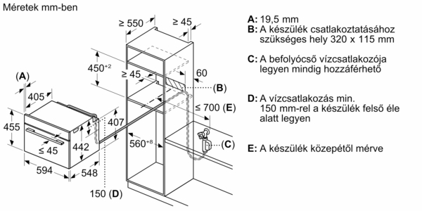 - Beépítési méretigény (ma x szé x mé): 450 mm – 455 mm x 560 mm – 568 mm x 550 mm