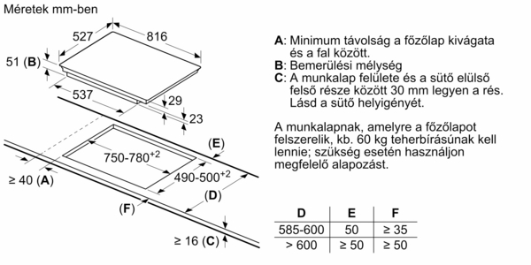 A beépítési méretigény (Ma x Szé x Mé): 51 x 750-780 x 490-500 mm