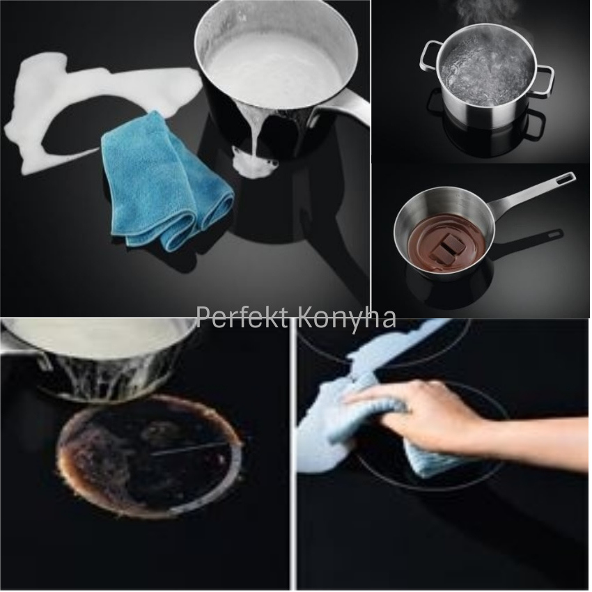 A főzőfelület főzés közben is tisztán tartható. Az indukciós technológiának köszönhetően a főzőzóna körüli terület mindvégig hűvös marad. Magas hőmérsékletnél is a kiömlött étel gyorsan és biztonságosan, késedelem nélkül feltakarítható.