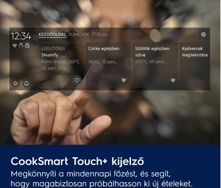 CookSmart Touch+ felülettel élvezetesebb a főzés folyamata, útmutatóval segít elérni a tökéletes eredményeket, miközben energia is megtakarítható. Kedvenc ételek és módszerek elmenthetők az alkalmazásban és egy gombnyomással elküldhetők a sütőnek.