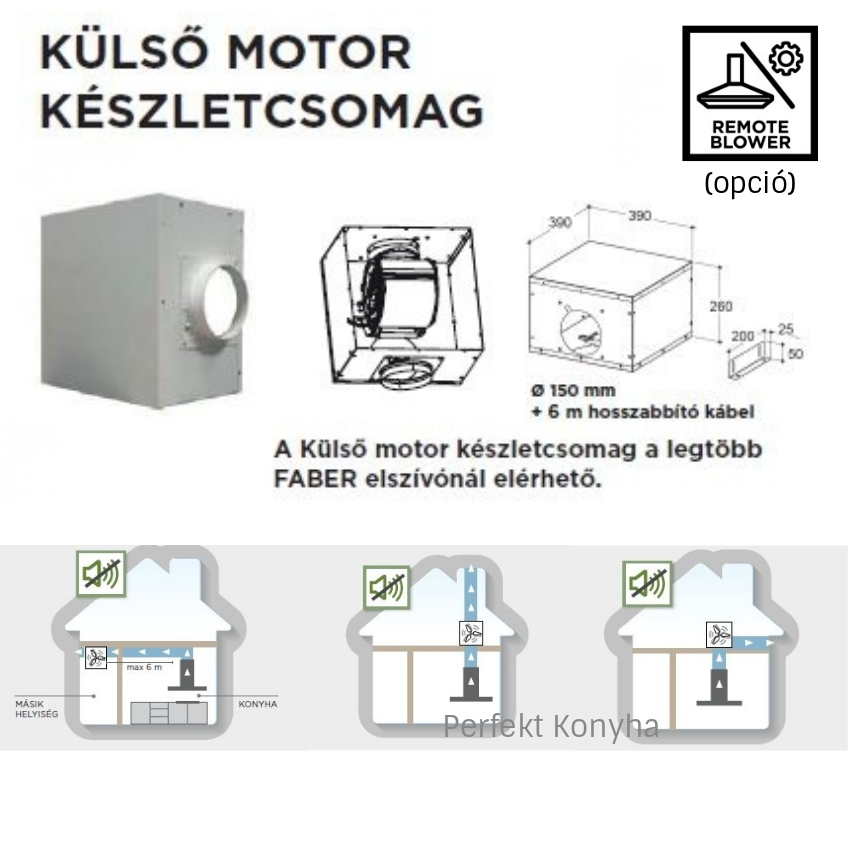 A FABER elszívónál a zaj forrásának (a motornak és a ventilátornak) áthelyezésével a zaj gyakorlatilag megszűnik. A FABER Külső motor készletcsomag lehetővé teszi a motor eltávolítását az elszívóból és egy másik helyiségbe telepítését, így a motor által keltett zajok a konyhán kívülre kerülnek.