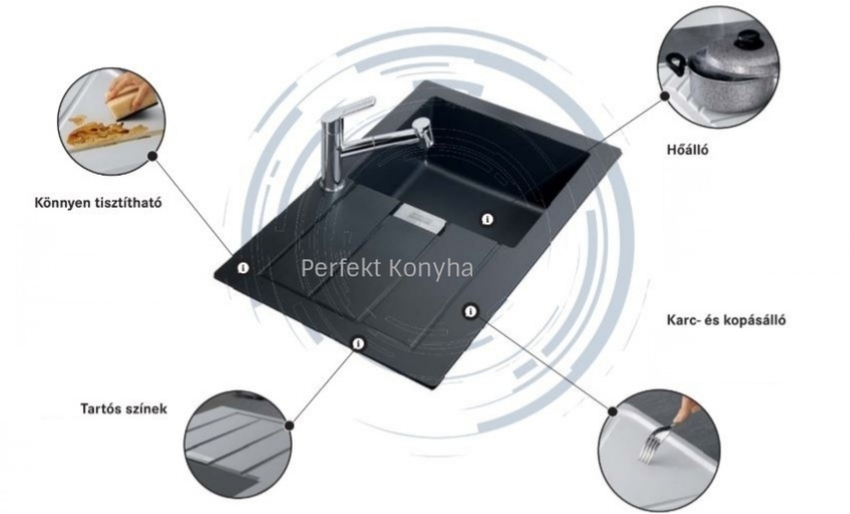 - Karc- és kopásállóság - a mosogatótálca felületébe ágyazott üveg, a Tectonite® anyagok új szerkezete szavatolják a nagyobb karc- és kopásállóságot. Kopásállósága nagyobb, mint a piacon kapható többi kompozit-anyagé.