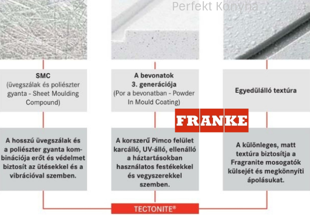 A TECTONITE® Franke innovatív és szabadalmaztatott szintetikus anyag. Garantálja a mosogató kiváló minőségét és modern kinézetét.