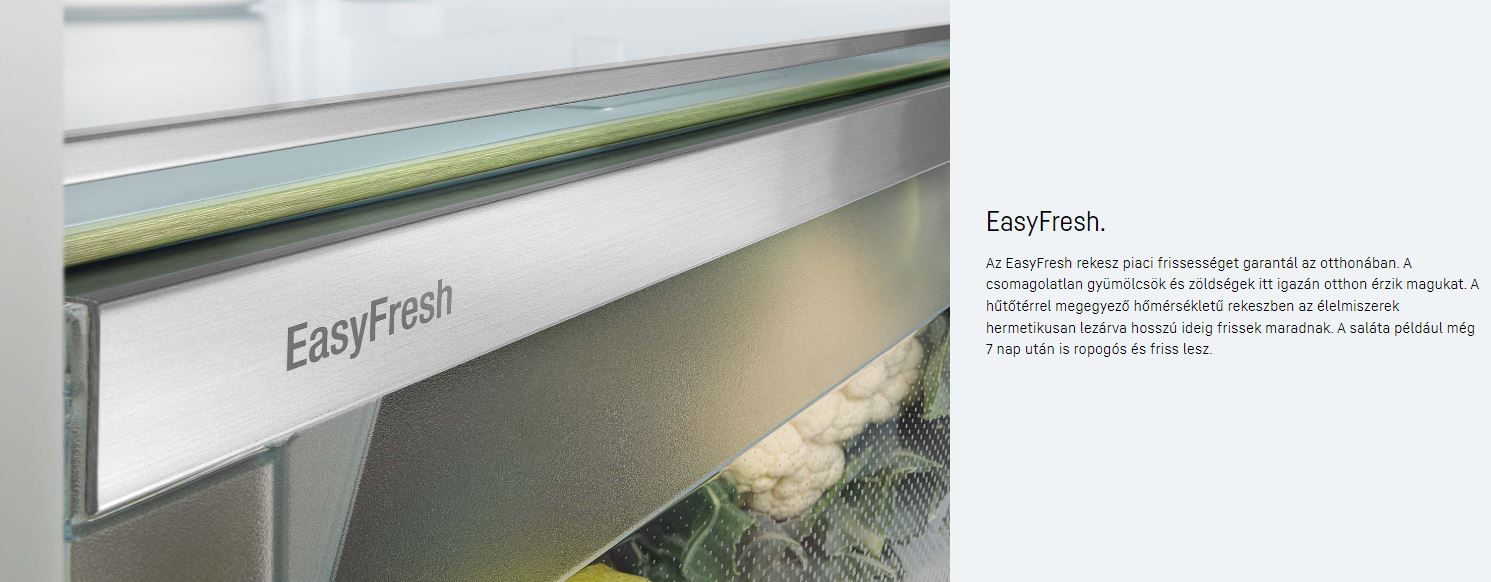 Az EasyFresh technológia fenntartja a páratartalom és a hőmérséklet tökéletes egyensúlyát, ami segít a természetes tárolási feltételek megteremtésében. A légmentes záródásnak köszönhetően az élelmiszer megemeli a páratartalmat a rekeszben, így az étel hosszú ideig friss marad.