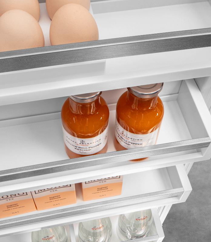 - Ajtópolcok - biztonsági üvegből és nemesacél rácsokból álló, állítható magasságú ajtópolcok. A mozgatható és kivehető palacktartó gondoskodik a palackok stabilitásáról.