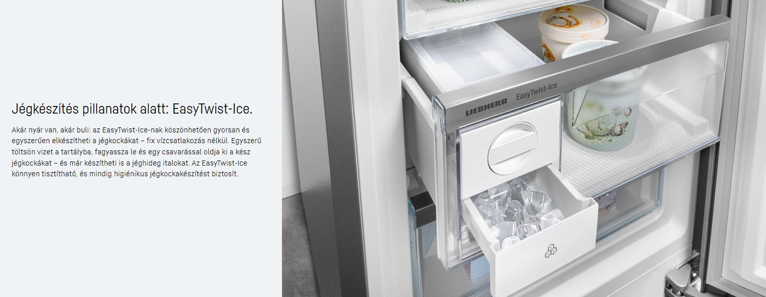 - Easy Twist Ice – a jégkockák gyors és egyszerű elkészítése fix vízcsatlakozás nélkül. Csak fel kell tölteni a tartály vízzel, majd lefagyasztani és egy csavarással kioldhatók a jégkockák. Könnyen tisztítható és mindig higiénikus jégkockakészítést biztosít.
