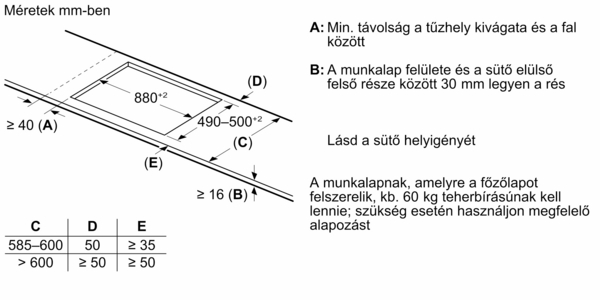 - A beépítéshez szükséges résméret (Ma x Szé x Mé mm): 51 x 880 x (490 - 500)