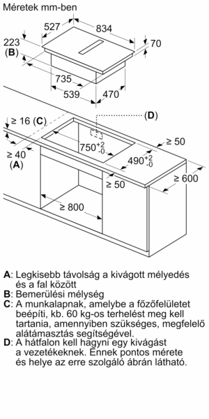 • A beépítéshez szükséges résméret (Ma x Szé x Mé): 223 x 750 x (490 - 500) mm