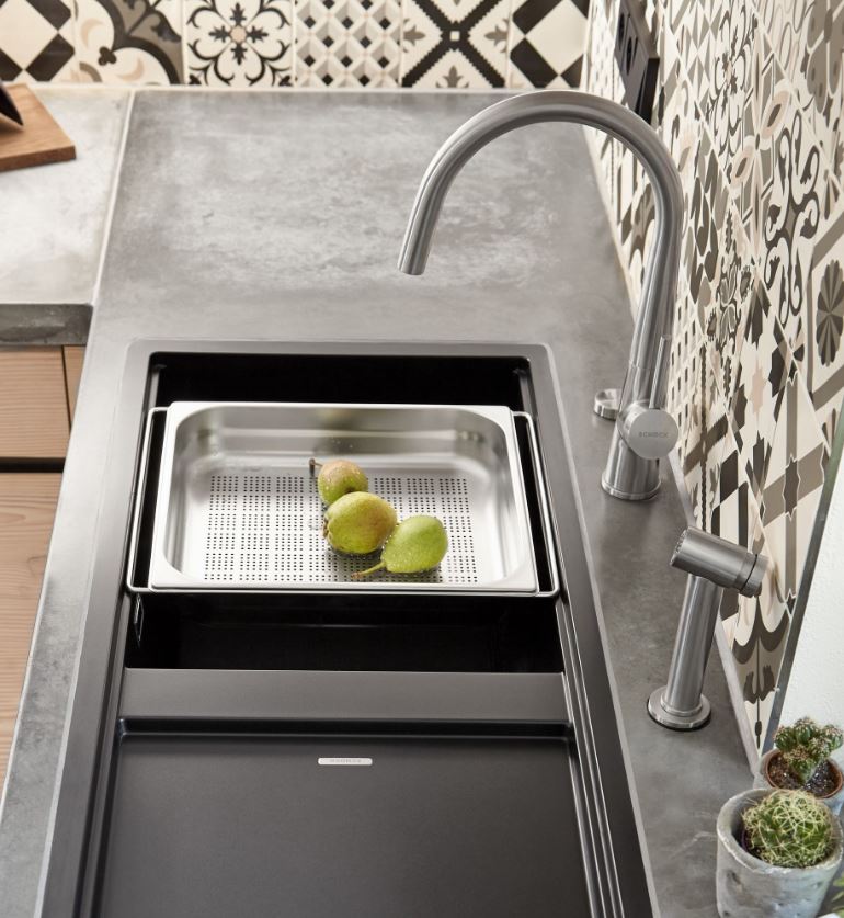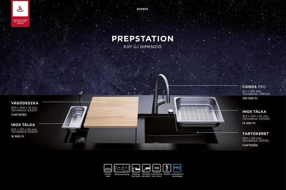 A Schock Prepstation D-150 modell esetében a spirituálisan forradalmi, kivételes funkcionalitás és a művészet ötvözve alkot egy egyedi öblítési koncepciót. Ennek a piacon teljesen egyedülálló modellnek köszönhetően a konyhában rendelkezésre álló további munkaterület egyedülálló élményt biztosít a főzés és a mosogató körüli szokásos feladatok terén. Ráadásul a többfunkciós kialakításnak köszönhetően - amely támogatja az ételkészítést, valamint a zöldségek és gyümölcsök mosását és lecsepegtetését -, ez a termék több, mint egy egyszerű mosogató. A termék árában található további egyedi kiegészítők, mint például az inox tálkatartó rács és az egységes kialakításba tökéletesen integrált fa vágódeszka sokrétű tevékenységet tesz lehetővé. Ennek a modellnek az ergonómiája az csaptelepre is kiterjed. A gyártó azt javasolja, hogy ezt a mosogató modellt a Schock Conos Pro konyhai csapteleppel kombinálja. Praktikusság szempontjából ez a csaptelep modell a zuhanyfunkciós teleszkópos fej révén professzionális hangnemben közelíti meg az ételkészítés teljes folyamatát.
