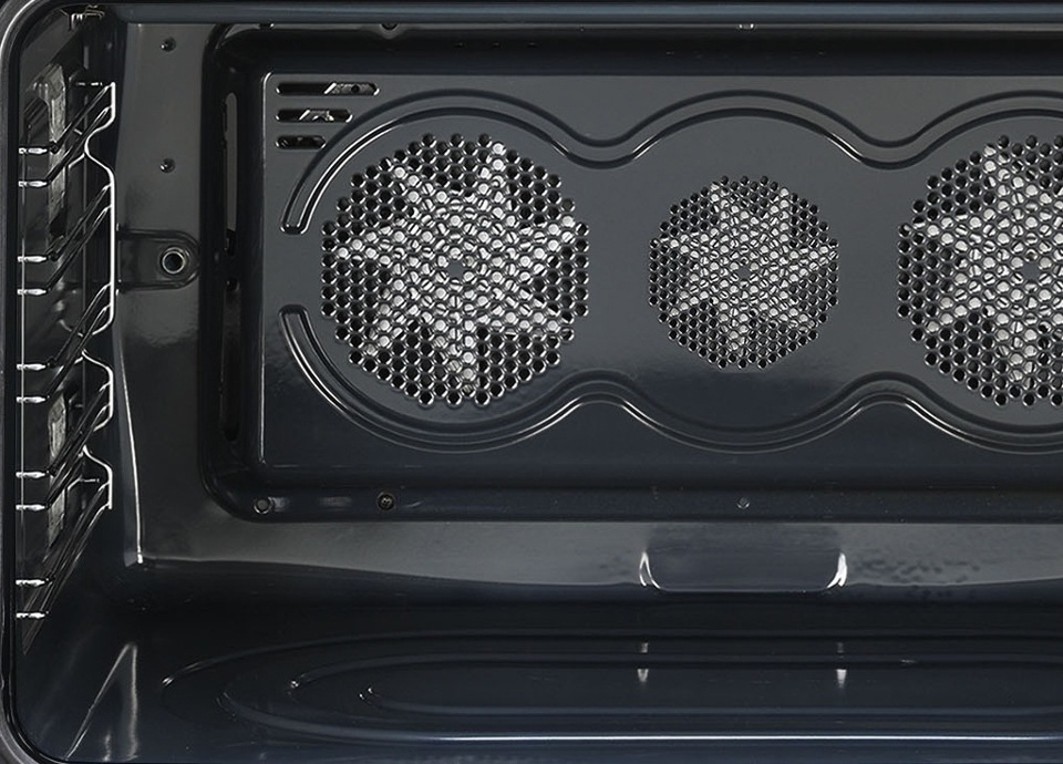 Hármas ventilátor technológia - a sütő exkluzív háromventilátoros rendszerrel van felszerelve, amely a motorok nagyobb teljesítményével kombinálva kiváló főzési teljesítményt tesz lehetővé. A két nagy oldalsó ventilátor elosztja a levegőt az üreg kerülete mentén, míg a kis központi ventilátor függőleges hőörvény létrehozásával növeli a szellőzést. Ez az egyenletes hőmérséklet lehetővé teszi, hogy mind az öt szinten az egyenletes főzést, akárcsak a professzionális konyhákban.